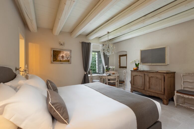 Avvolta nei toni caldi del verde e della luce naturale, Rosmarinus è una camera che accoglie gli ospiti in un ampio ambiente con travi a vista e materiali naturali che raccontano la storia del luogo, mentre la vista sulla corte interna e sul giardino, regala scorci di relax e bellezza autentica.