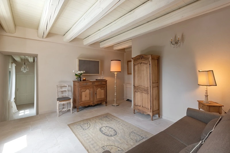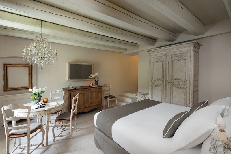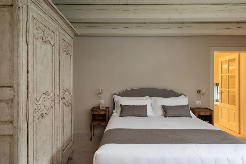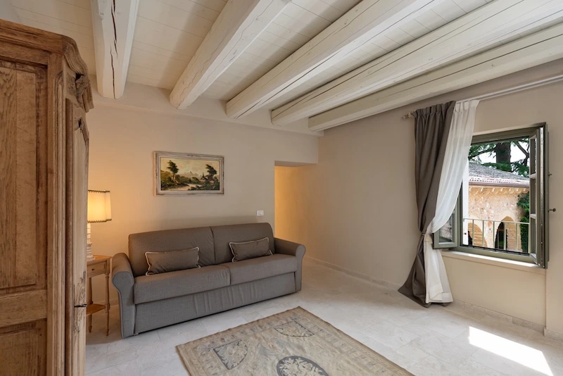 La suite s’ouvre sur un vaste espace avec canapé-lit et télévision : un lieu à vivre, pensé pour le repos. La chambre double, très accueillante, présente un mobilier élégant et chaque détail a été choisi pour évoquer une beauté authentique et intemporelle, avec des matériaux nobles et un savoir-faire artisanal.