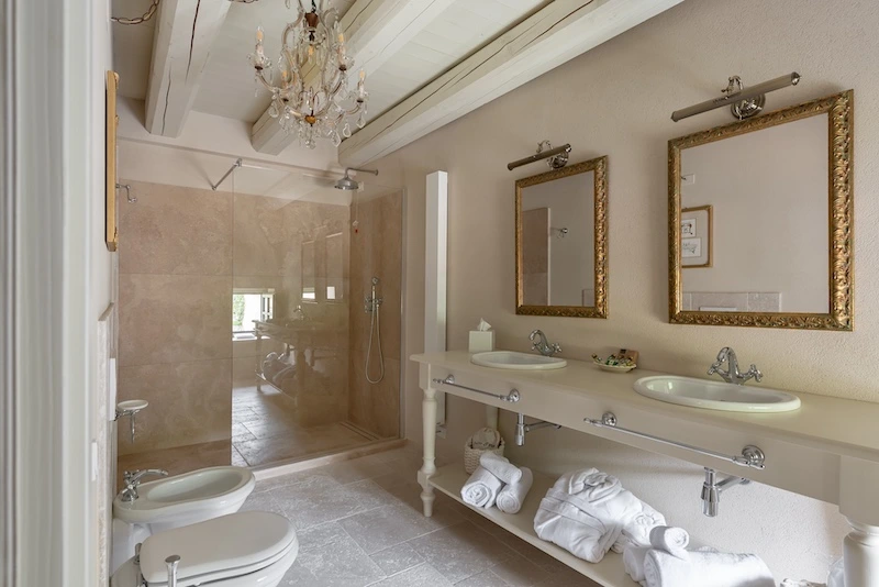 La salle de bain, spacieuse et lumineuse, est une véritable invitation au bien-être : double vasque, grande douche et ouvertures discrètes complètent l’expérience.