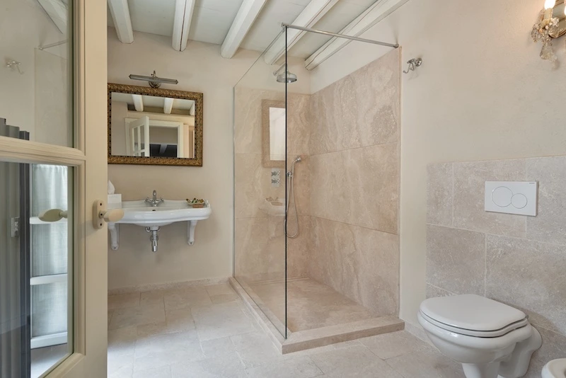 Affacciata sulla corte interna, offre scorci autentici che raccontano la bellezza del luogo. Il bagno, ampio e luminoso e’ dotato di una doccia spaziosa in marmo travertino.